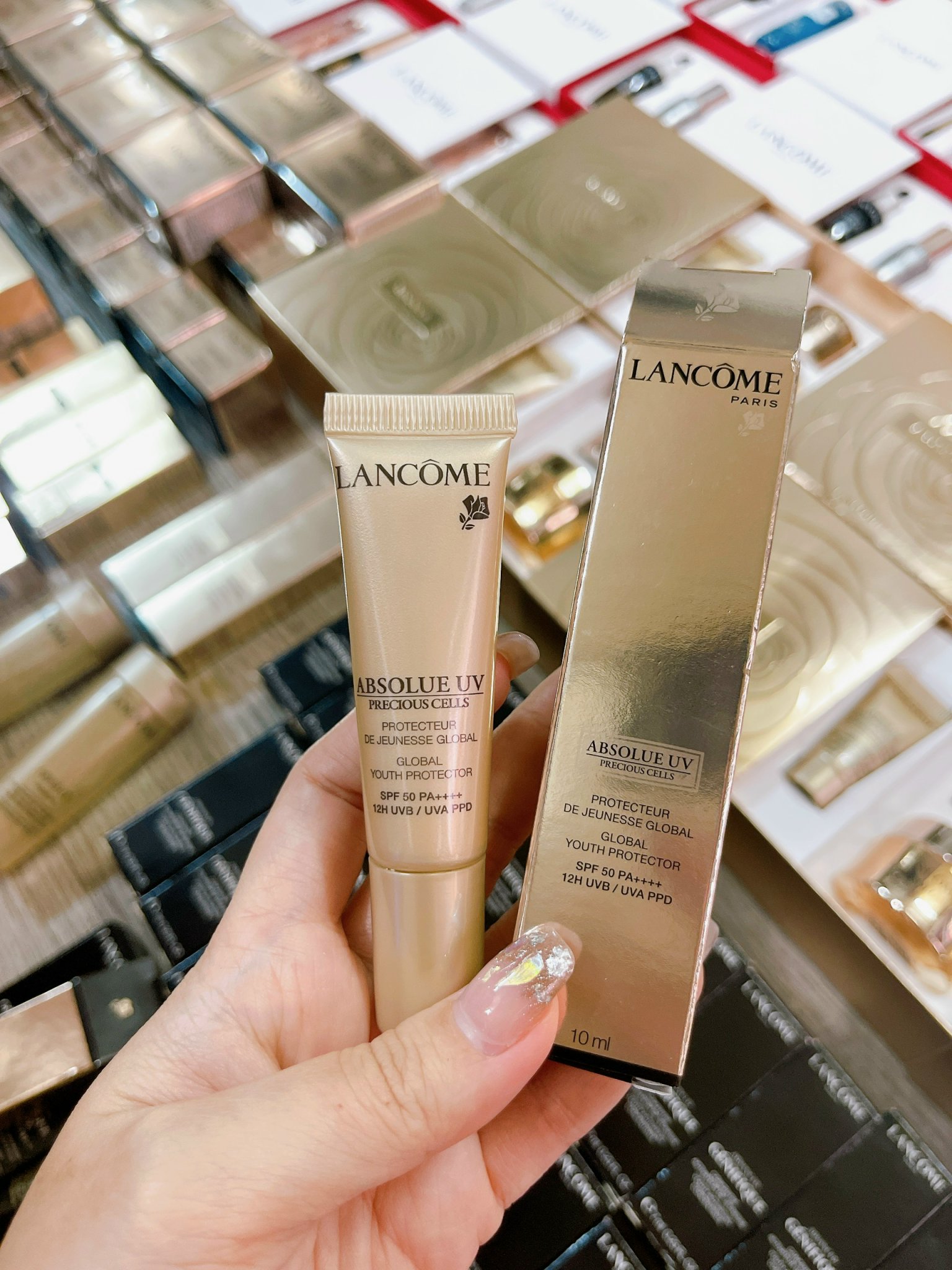 + Kem chống nắng Lancôme Absolue Percious Cells UV Protector SPF có chỉ số chống nắng 50/PA+++ ngăn tác hại của tia UV đến 98%, đồng thời có tác dụng bảo vệ da hơn 10 giờ đồng hồ. Điều đặc biệt, chất kem mềm mịn của sản phẩm này thấm cực nhanh vào da, cho bạn cảm giác dễ chịu không gây nhờn rít hay bí lỗ chân lông.